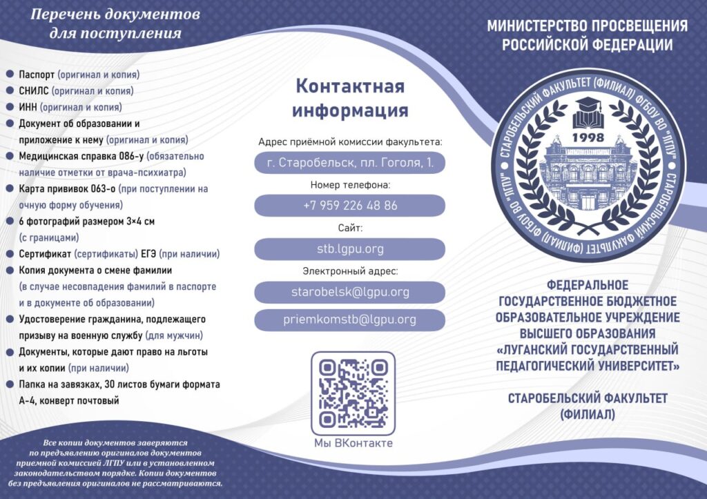 Адрес приёмной комиссии факультета: 292700, Российская Федерация, ЛНР, Старобельский МО, город Старобельск, пл. Гоголя, д. 1.