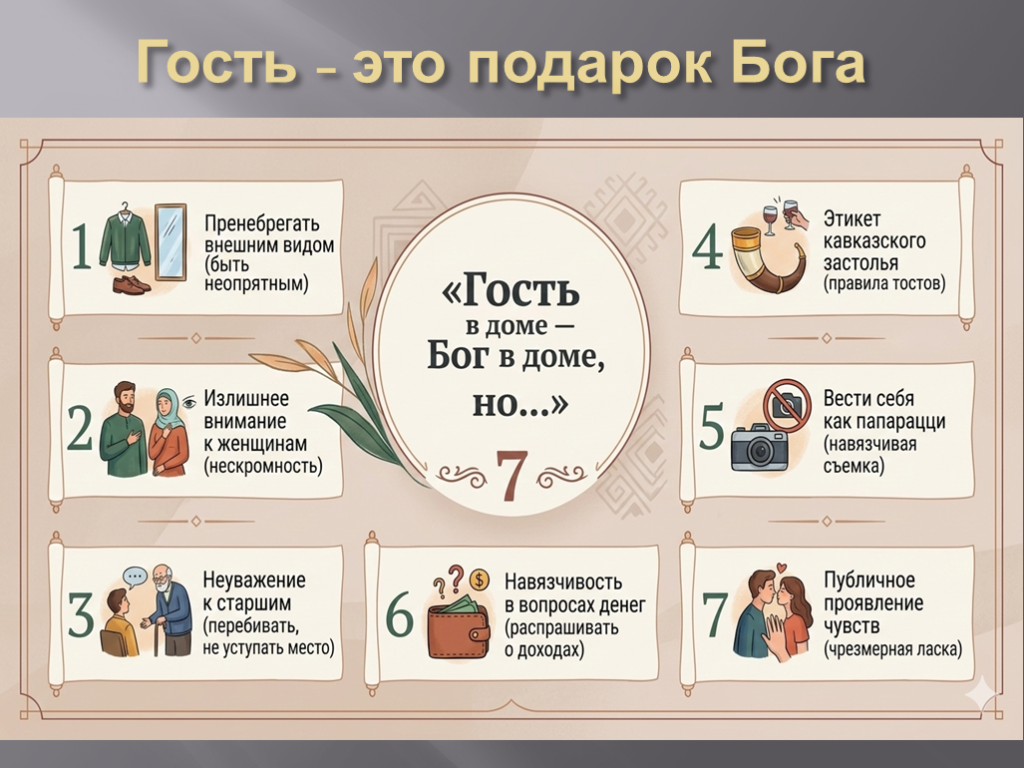 Особый интерес вызвал практический блок, посвящённый этикету и тому, как не «потерять лицо», оказавшись в гостях на Кавказе. Мы обсудили «7 золотых правил гостя»: от требований к внешнему виду до тонкостей кавказского застолья. Эти знания помогут путешественникам стать желанными гостями, ведь бережное отношение к чужим традициям – это ключ, открывающий любые двери.