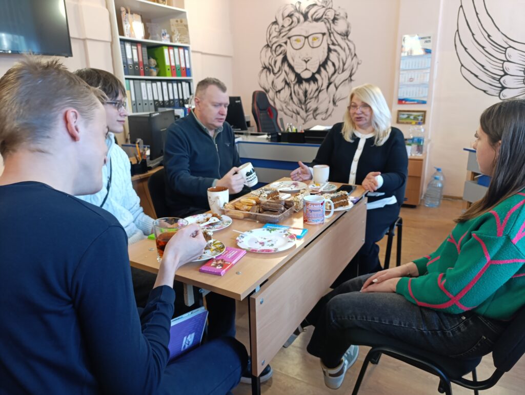 Студенты вместе с социальным педагогом Ольгой Костырко и заместителем директора Виталием Бурьяном собрались за чаепитием в тёплой и доверительной обстановке